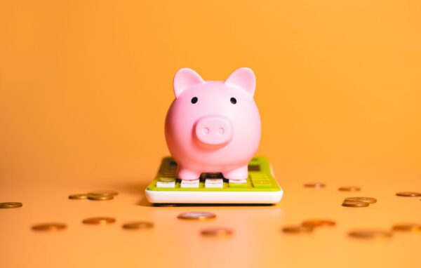 Pink piggy bank placed on top of a calculator, surrounded by scattered coins on a solid orange background.